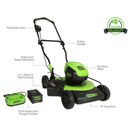 60V 19" Cordless Battery Push Lawn Mower w/ 5.0Ah Battery & Charger - $261 greenworkstools.com