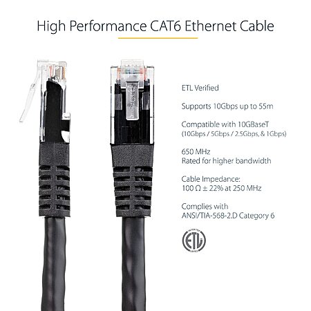 StarTech 100ft CAT6 Ethernet 10Gbps Cable Amazon $16.79 - Black CAT 6 Gigabit Ethernet-650MHz 100W PoE++ RJ45 UTP Molded Category 6 Network/Patch Cord Fluke Tested (C6PATCH100BK)