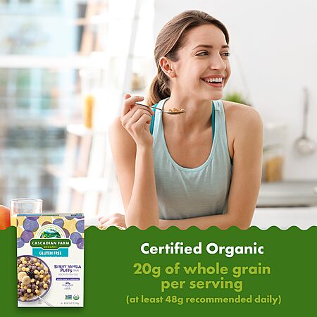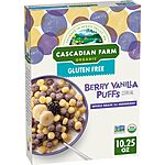 Amazon[amazon.com] has 10.25-Oz Cascadian Farm Organic Berry Vanilla Puffs Cereal (Gluten Free) for $3.22 when you 'clip' the 25% discount coupon on the product page and check out with Subscribe & Save. Shipping is free w/ Prime or on $35+.