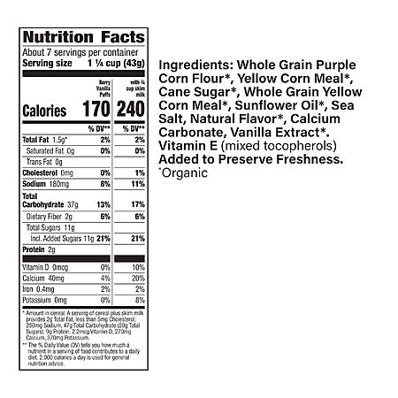 VANILLA CEREAL: Made with organic whole grain puffs lightly sweetened with natural berry flavor