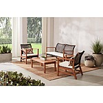 • Update your patio or deck with this Hampton Bay Clover Cay four-piece conversation seating set. Curved set-back arms on chairs, three padded seat cushions and four back cushions keep you and your guests comfortable. Built to last, it features waterproof acacia wood frames and all-weather cushion covers.