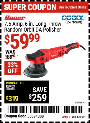 $30 off was $89.99. Coupon came out today and good till June 6 per their app or website. Been recommended and hasn't been this price since Christmas. Highly reviewed. Just picked it up today. Good videos out there. Happy polishing! https://www.harborfreight.com/pow...56367.html