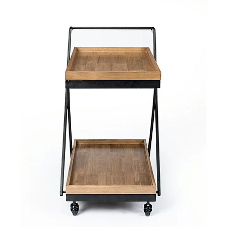 • A contemporary design that consists of two removable wood trays and a black metal frame.