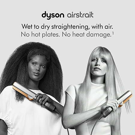 Your routine, simplified. The Dyson Airstrait™ dries and straightens hair simultaneously. Take hair from wet to a finished look – with one machine. Our latest hair care technology uses high-pressure airflow to straighten hair as it dries. Air is precisely heated and projected evenly through the tress as you style – with no heat damage.¹ Intuitive airflow when you need it. Your machine senses when hair is between the arms and automatically drops to low airflow when it's not – for quieter, more efficient styling. Engineered to maintain hair strength and protect shine.³ Our latest hair care innovation combines our expertise in airflow with everything we've learned about hair styling to pioneer a new way to straighten – with no heat damage.¹ FEATURES Airflow is projected downwards at a 45° angle to create the tension needed to align hair for a smooth end style – with less damage and breakage.² Glass bead thermistors, located in the machine arms, regulate airflow temperature up to 30 times per second to prevent heat damage and protect hair's natural shine. Dyson Hyperdymium™ motor has a 13-blade impeller that spins up to 106,000rpm, propelling 11.9 liters of air through the machine per second. This generates 3.6kPa of air pressure, powerful enough to straighten hair as it dries. LCD screen features a high-definition color display that shows airflow and temperature settings for easy reference when styling. Lock feature allows you to slide the button to lock and unlock the arms of your machine. Use with the arms locked to gently pre-dry hair and create volume from the roots. Auto-pause occurs after three seconds of inactivity. Your machine will automatically pause to save energy. Simply move the machine to restart the airflow. KEY CONTROLS Two styling modes: Wet to Dry and Dry mode. Three precise airflow speeds and heat settings in each mode. Auto-pause after three seconds of inactivity STYLING TIPS Straightening from wet: Start with towel-dried hair and select Wet mode. Select maximum airflow and high temperature. Lock arms and rough dry the roots. Once roots are dry, unlock arms and select desired airflow and temperature. Straighten and style damp hair in sections. Straightening from dry: Select Dry mode to touch-up or refresh your style. Select desired airflow and temperature, Boost mode is available if required. Straighten hair in sections. ¹When used in wet to dry mode. ²When used in wet to dry mode vs. hot plate straighteners which operate with extreme heat. ³When used in wet to dry mode vs. unstyled, untreated hair. In the box: .
