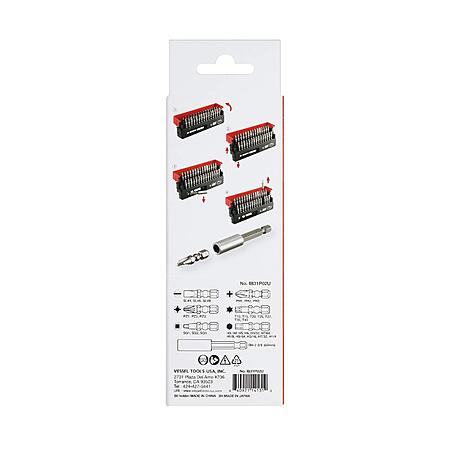 - Including +1, +2, +3, SL4, SL6, SL8, SQ1, SQ2, SQ3, T10, T15, T20, T25, T27, T30, T40, PZ1, PZ2, PZ3, H3, H4, H5, H6, H3/32, H7/64, H1/8, H9/64, H3/16, H7/32, H1/4"& 1/4" Hex Bit Holder with C-Ring retainer