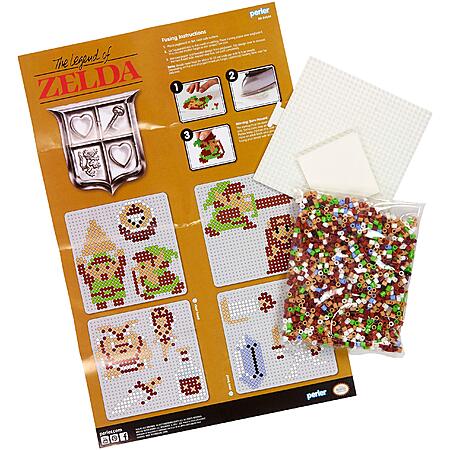 Reminisce with your favorite classic Nintendo game with the legend of Zelda fused bead kit! with cranapple, rust orange, Kiwi Lime green, blueberry cream, tan, black white, and clear beads, you can make all of your favorite nes icons! this is a perfect craft for a party or gift for a legend of Zelda collector. Kit includes (2000) beads, (1) large square pegboard, ironing paper, (1) pattern sheet, and easy-to-follow instructions. Kit package measures 8''L x 8''w x 1.75''H.. for ages 6 and up.