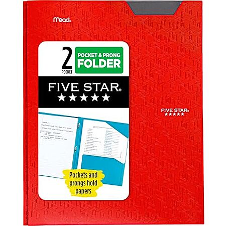 Model: Five Star 2 Pocket Folder, Stay-Put Folder, Plastic Colored Folders with Pockets & Prong Fasteners for 3-Ring Binders, For Home School Supplies & Home Office, 11” x 8-1/2”, Red (72109)