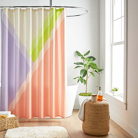 Ignite a strikingly bold look into your bathroom with the Mainstays Colorblock shower curtain. The cheerful combination of vanilla, peach, lime, and lavender makes for a sweet look that instantly refreshes your mood when you are ready for a bath. The printed face features a colorblock pattern that is perfect for a guest or young adult bathroom in need of a pop of color. Add to this playful look by mixing your bathroom décor with vibrant colors. This shower accessory is made of recycled polyester for a durable choice. Hang this shower curtain with ease using the buttonhole header. Simply use your choice of shower hooks or rings (sold separately) to flaunt this bathroom décor style.
