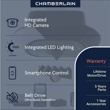 Home Installation + 2yr Warranty + Chamberlain Secure View 3/4 HP LED Video Quiet Belt Drive Smart Garage Door Opener with Integrated Camera B4643T B4643T - $307.20