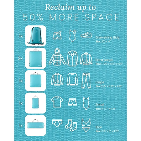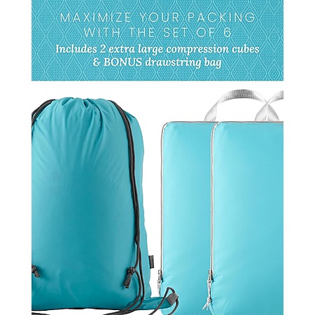 - 6-Piece set: Includes one Drawstring Bag ideal for laundry or shoes, two Extra Large cubes ideal for winter coats and sweaters, one Large cube ideal for button downs and jeans, one Small cube ideal for t-shirts and shorts, and one Slim cube for undergarments to complete your travel needs! Stay organized during your travels with this convenient set of five compression cubes and bonus drawstring bag!