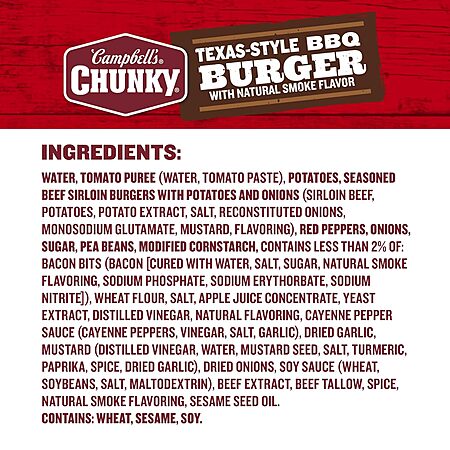 Model: Campbell’s Chunky Soup, Texas-Style BBQ Burger with Natural Smoke Flavor, 18.8 oz Can