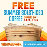 Celebrate the summer solstice with Whataburger on June 20th from 6am-6pm and enjoy a free 16 oz. iced coffee when you order online, in-app, or in-store.