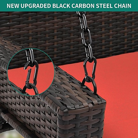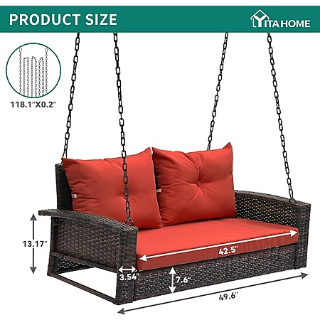 Model: YITAHOME Wicker Hanging Porch Swing Chair Outdoor Brown Rattan Patio Swing Lounge w/ 2 Back Cushions Capacity 530lbs for Garden, Balcony, Living Room, Red