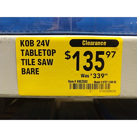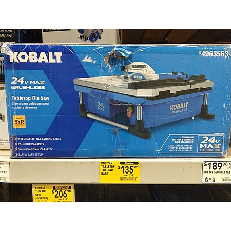 YMMV - In-store only - Lowes has the Kobalt 24V brushless 7" tile saw (bare tool) on clearance for as low as $136. Includes wet saw with full sliding table, 7" diamond blade, adjustable fence, and miter gauge. Note: this is a "bare tool" so it does not include 24V 4AH batteries. This tool may be located in the tile tools section of your store or up on a shelf. An employee can check the real inventory at your store and surrounding stores via the item number (4963563).