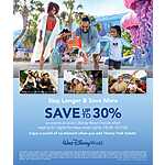 Offer excludes the following room types: 3-Bedroom Villas; Standard View, Water or Pool View at Disney's Caribbean Beach Resort; Treehouse Villas at Disney's Saratoga Springs Resort & Spa; Cabins at Copper Creek Villas & Cabins at Disney's Wilderness Lodge; Bungalows at Disney's Polynesian Villas & Bungalows; Deluxe Studios – Club Level, 1-Bedroom Villas – Club Level and 2-Bedroom Lockoff Villas – Club Level at Disney's Animal Kingdom Villas – Jambo House; Disney Vacation Club Cabins; The Campsites at Disney's Fort Wilderness Resort; and Club Level and Suites at Disney Moderate and Deluxe Resort hotels.