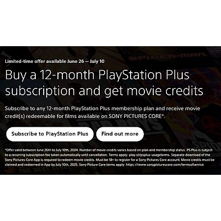 Subscribe to any 12-month PlayStation Plus membership plan and receive movie credit(s) redeemable for films available on SONY PICTURES CORE. Each credit is valid for one movie.
