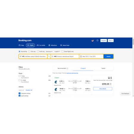 Nice airfare travelling to and from Atlanta (ATL) and Oahu Honolulu Hawaii (HNL) for $360 on Alaska Airlines, making 1 stop. The ATL-HNL trip will make a stop in San Diego for up to 23 hours so plan ahead. These are saver fares, a restricted-type fare that will allow you to have a personal item and a carry-on bag. There is no seat selection and no change. If you are travelling with children, you will be seated together as per Alaska's policy.