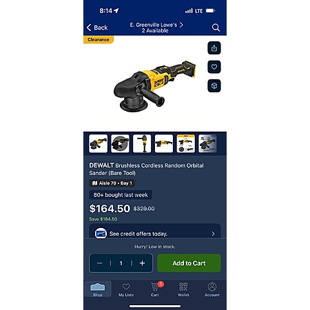 Local Lowe's has the Dewalt Random Orbital Sander on clearance for $164.50. Might be a unicorn though. I checked a few other Lowe's in the area and everywhere else was on clearance as well, but at a price of $263.17. Still a solid price, but not $164.50.