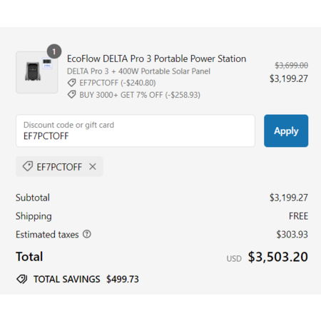 Delta Pro 3 + 400 watt solar panel is also $3199 after 7% off (automatic in cart) and coupon code EF7PCTOFF