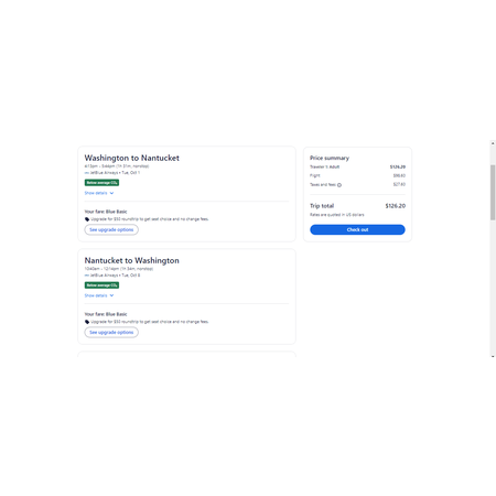 JetBlue Airways have round trip airfares travelling to and from Washington DC (DCA) and Nantucket MA (ACK) for $127, nonstop. These are basic blue fares, a restricted-type fare that will allow a personal item only. However, after Sept 6th, you may have a carry-on bag as well. There is no seat selection and no change. If you are travelling with children you will be seated together as per JetBlue's policy.