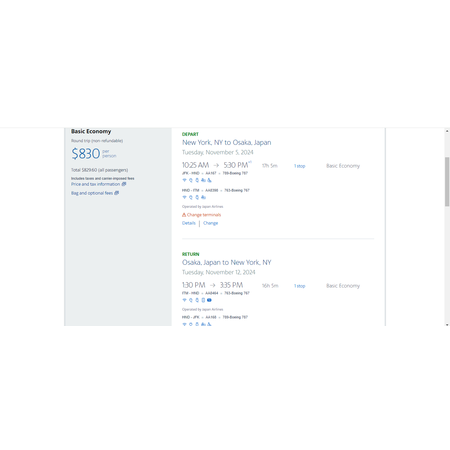 Japan Air Lines via American Airlines have round trip airfares travelling from New York (JFK) to Osaka Japan (ITM) for $830, making 1 stop in Tokyo both ways. These are basic economy fares that will only allow a personal item and a carry-on bag. There is no seat selection, no checked bags and no change.