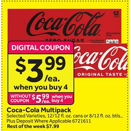 Coca Cola brands 12 pack cans - $3.99 each when buying 4 at Stop & Shop - ends 7/8