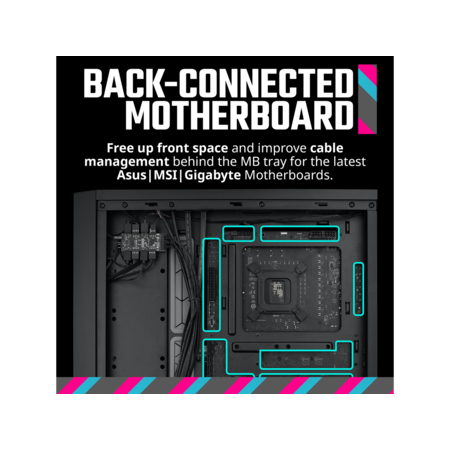 - Back-Connected Motherboard: Free up front space and improve cable management behind the MB tray for the latest Asus|MSI|Gigabyte Motherboards
