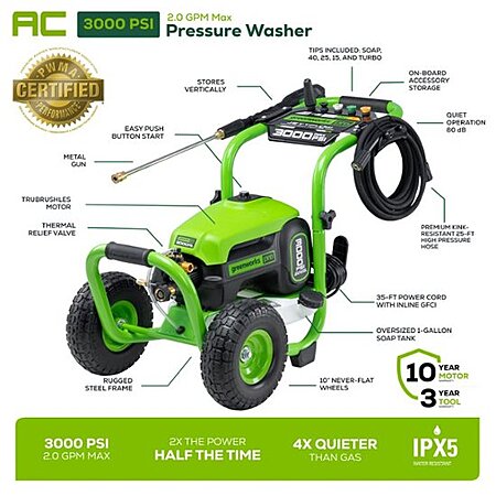With up to 3,000 PSI at 2.0 max GPM, the Greenworks GPW3001 pressure washer is a powerful residential electric pressure washer. With a powerful 14-amp TRUBRUSHLESS motor, axial cam pump, and hassle-free, push-button starts, you'll get to work fast; just plug the 35-foot power cord into any typical exterior household outlet for quick starts with no priming, no choke, and no pull cord. This quiet-running, lightweight, compact, easy-to-store pressure washer features a rugged steel frame and wheel barrow design, thermal relief valve that purges hot water from the pump to cool it down during constant use, and intelligent PCBA technology that automatically senses which pressure washer nozzle is being used, and adjusts motor speeds to auto-adapt for more pressure and water flow for maximum cleaning power. With a 25-foot, non-marring, high-pressure hose, oversized one-gallon soap tank with built-in detergent system, and on-board accessory storage with 15-, 25- and 40-degree nozzles, turbo nozzle, and soap nozzle tips, it's versatile, portable, and powerful.