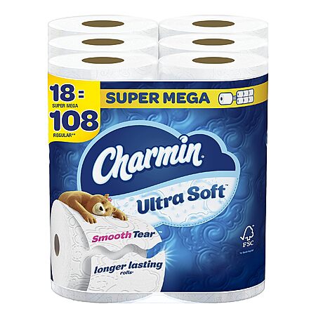 18-Count Super Mega Rolls Charmin Ultra Soft Toilet Paper + 18-Count Mega Rolls Charmin Ultra Soft Toilet Paper on sale for