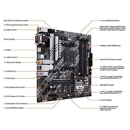 Model: ASUS Prime B550M-A AC AMD AM4 (3rd Gen Ryzen™) Micro ATX Motherboard (PCIe 4.0, WiFi, ECC Memory, 1Gb LAN, HDMI 2.1/D-Sub, 4K@60HZ, Addressable Gen 2 RGB Header and Aura Sync)