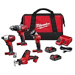 Home Depot[homedepot.com]has Milwaukee M18 18V 4-Tool Cordless Combo Kit w/ 2-Batteries, Charger and Tool Bag (2696-24CXH) on sale for $229. Shipping is free.