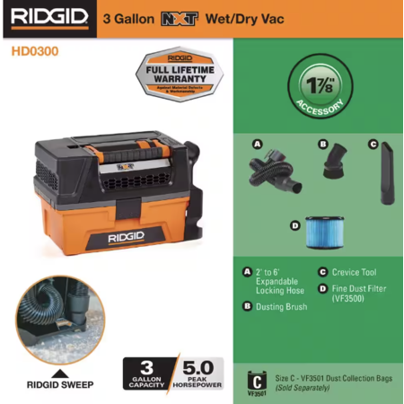 Be prepared for your next mess with the RIDGID 3 Gal. 5.0 Peak HP NXT Wet Dry Vacuum – store it, stack it, move it. The compact, lightweight toolbox design is the perfect companion for those looking for a small yet powerful vac they can take from project to project. Designed with storage in mind, this 3 gal. shop vac fits into small, out-of-the-way spaces with the bonus of stacking. With the integrated storage compartment, accessories are organized and secured onboard so you are ready to grab-and-go at any time. The crevice tool can be used for tight, intricate places. The dusting brush can gently clean surfaces with care. The 6 ft., 1-7/8 in. hose features 360 maneuverability and resists collapsing. The exhaust port allows for blower functionality and the on/off switch can easily be turned on with one hand. The innovative RIDGID SWEEP feature is a suction-powered dustpan built right into the vac – sweep the dust directly into the shop vac or use it to glide over spilled areas. Backed by the full lifetime warranty, RIDGID proves that even the messiest of jobs can be the easiest to handle. Pro Tip: RIDGID filters help to maintain the power of the vac and extend vacuum life. Purchase a shop vac wet filter (VF3700; sold separately) to clean up wet messes or add a RIDGID dust collection bag (VF3501; sold separately) to the shop vacuum to keep the wet dry vac drum clean and for quick pickup and disposal. 18V Cordless 3 Gal. wet dry vac (HD0318) also available.