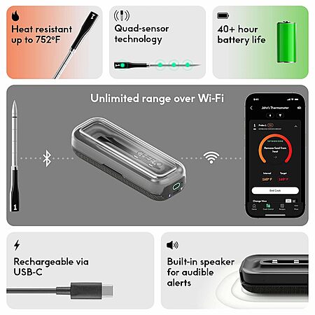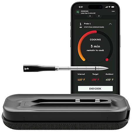 • This smart cooking thermometer takes away the guesswork with real-time internal temperature updates, flip reminders, rest indicators, estimated time left, and more.