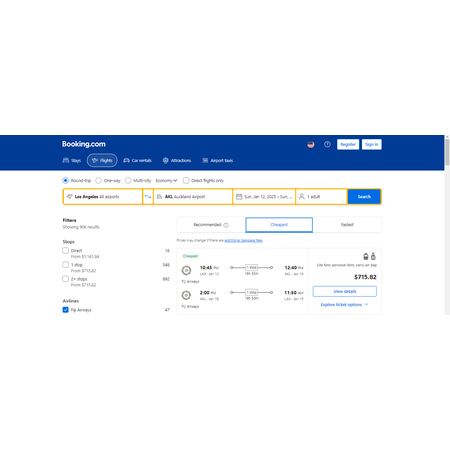 Fiji Airways via Booking.com have round trip airfares travelling from Los Angeles (LAX) to Auckland New Zealand (AKL) for $716, making 1 stop in Fiji's Nadi International both ways for a couple of hours. Your economy lite airfare includes a personal item and a carry-on bag. Seat selection, change and checked bags are optional extras that you can choose to pay for.