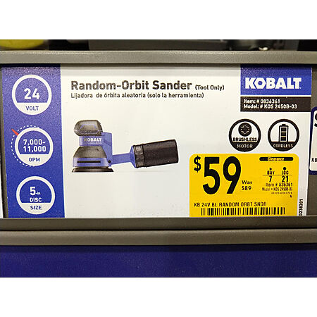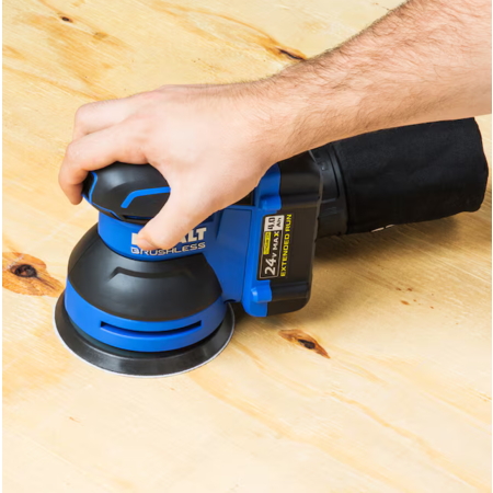 Lowes has the Kobalt 24 Volt Brushless Random Orbital Sander with dust management on clearance for $59.00 or lower. In your area, if available, it may be in-store only. This sander is a 5" 8-hole velcro-type sander with a 1ΒΌ" dust port for a shop vac.