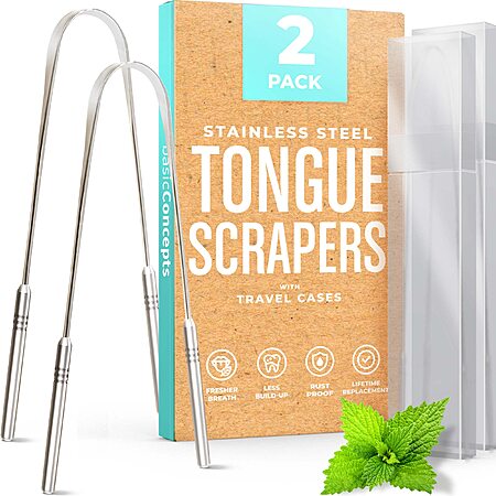 basicConcepts via Amazon has 2-Pack Basic Concepts Tongue Scraper for Adults (Stainless Steel) w/ Travel Case for $3.19 when you 'clip' the 50% coupon on the product page and checkout via Subscribe & Save. Shipping is free with Prime or on $35+ orders.