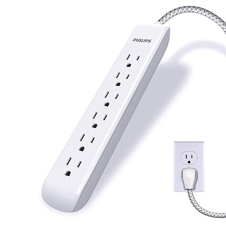 Your power does more with the Philips 6-Outlet Surge Protector. This powerful extension cord adds more outlets where you need them most and keeps your electronics protected from dangerous power surges. Extend the use of your wall outlet with 6 protected 3-prong outlets. The surge protector features an integrated circuit breaker that protects your electronics if the capacity is exceeded by a power surge and automatic shutdown technology to cut power if the components expire. It also features a surge protection rating of 720 Joules to ensure your electronics are safeguarded from voltage spike with AC connector. The surge protector's extra-long 4ft. braided fabric power cord is connected to a flat plug, allowing it to plug in easily behind desks, sofas and other furniture. Featuring a white and gray pattern, the decorative, woven fabric increases the cable's durability, is tangle-resistant and adds instant style to any space. For use in grounded (three-prong) outlets only, this product comes equipped with a $75,000 connected equipment policy and is backed by a limited-lifetime no-hassle replacement plan. Your outlet deserves an upgrade with the Philips 6-Outlet Surge Protector.
