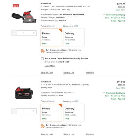 Milwaukee M18 FUEL 18V Lithium-Ion Cordless Brushless 6-1/2 in. Plunge Cut Track Saw (Tool-Only) - Home Depot Hack $285.31