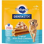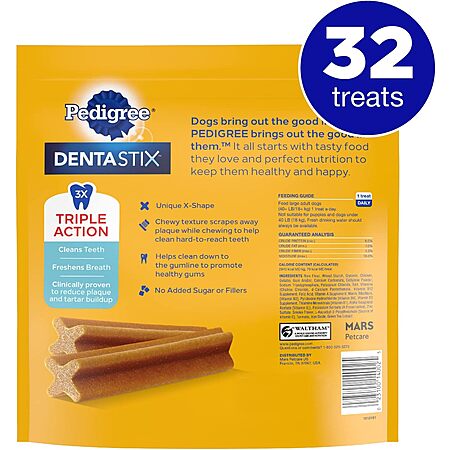 This pack contains 32 Pedigree Dentastix Original Flavor Treats for Large Dogs, weighing 1.72 lbs. The treats offer triple action: freshening breath, cleaning teeth, and reducing plaque and tartar buildup with their clinically proven texture. Designed for adult large breed dogs over 30 lbs, these dental chews have a unique X-shape and a tasty original chicken flavor. For maximum oral hygiene benefits, feed your dog one treat daily.