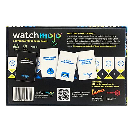 Model: WatchMojo: A Super Fan Top 10 Party Game, 400 Cards Included, Game Board, Dry Erase Scoreboard and Marker, for 3 to 10 Players, 20 to 30 Minute Play Time, for Ages 13 and up