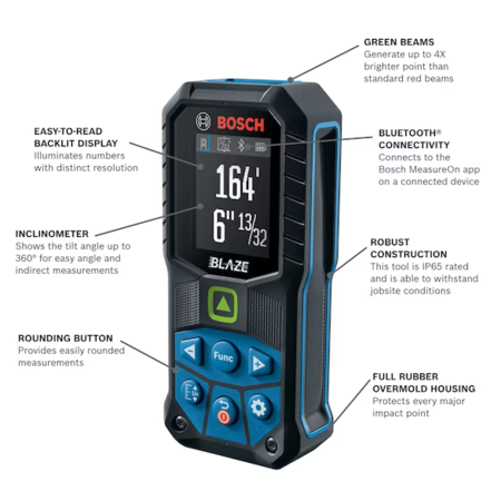 Model: Bosch BLAZE 165-ft Indoor Green Laser Distance Measurer with Backlit Display and Bluetooth Compatibility Rubber | GLM165-27CG
