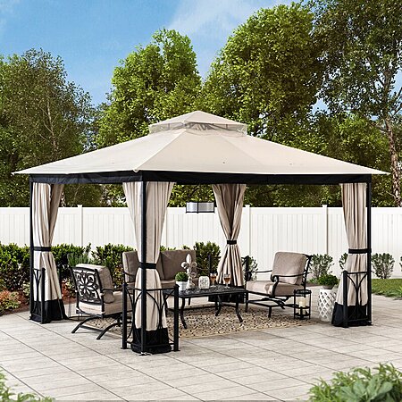 Sunjoy 11 ft. x 13 ft. Beige and Black Steel Gazebo with 2-tier Hip Roof& Reviews | Wayfair