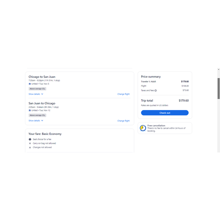 United Airlines and Expedia have round trip airfares travelling to and from Chicago (ORD) and San Juan Puerto Rico (SJU) for $180, making 1 stop. These are basic economy fares, a restricted-type fare that only allow a personal item. There is no seat selection, no carry-on bag and no change. If you are travelling with children, United will seat your family together as per their policy.