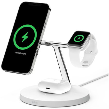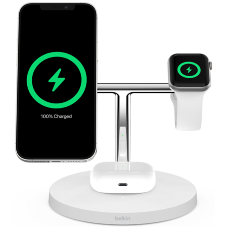 • Power your apple ecosystem with this Belkin 3-in-1 Wireless iPhone Charger Stand. It is the perfect charging station for multiple Apple devices, including iPhone 15, 14, 13 and 12, Pro & Pro Max, Apple Watch, and AirPods