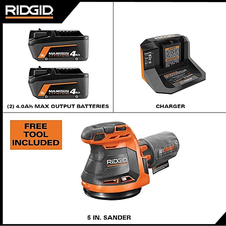 RIDGID 18V Max Output (2) 4.0Ah Battery and Charger with FREE 5 in. Random Orbit Sander R8606K2SB - $149.00