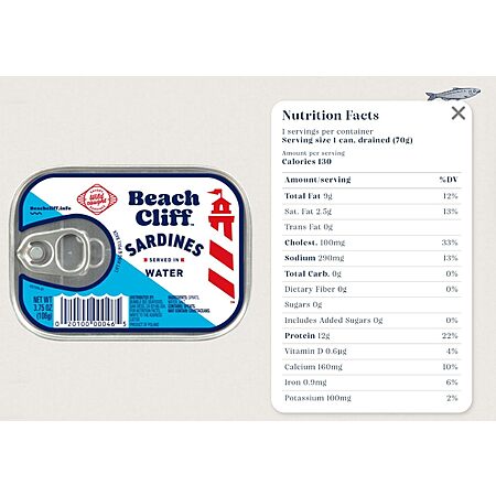 Amazon has 12-Count 3.75-Oz Beach Cliff Wild Caught Sardines in Water for $11.52 - 10% when you clip the coupon on the product page - 5% when you checkout via Subscribe & Save = $9.79. Shipping is free w/ Prime or on $35+ orders.