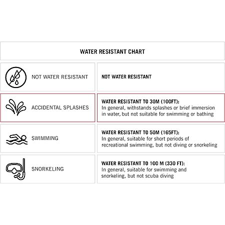 Water-resistant to 30 meters (99 feet): Generally withstands splashes or brief immersion in water but is not suitable for swimming or bathing.
