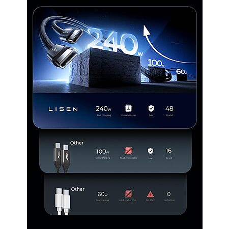 Charger power is sufficient:if your laptop requires more than 240W for charging (which is rate but possible),the charging maybe insufficient or unable to charge.Generally,most laptops require between 65W to 100W and a 240W cable can meet those needs.Ensure that both your laptop and charger are compatible with the PD protocol to enable high power charging.