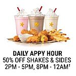 The regular price of a milk share at a Southern California Carls Jr is $5.39, so the Appy Hour price would be $2.70. The shakes are good. The price of waffle fries, zucchini, and onion rings, jalapeno popper bites are $4.69, so those are $2.35. Large fries are $3.99, so those are $2.00.