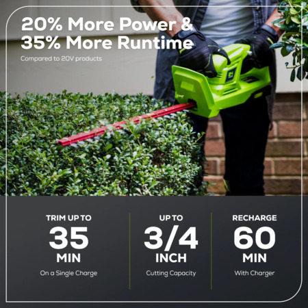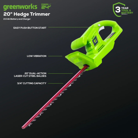 The Greenworks 24V Cordless 20" Hedge Trimmer is the perfect tool to keep your hedges, bushes and shrubs perfectly manicured. Dual-action steel blades deliver powerful results without the hassle of gas and oil. Greenworks' 24V battery platform powers a family of 125+ tools for both indoor and outdoor use.